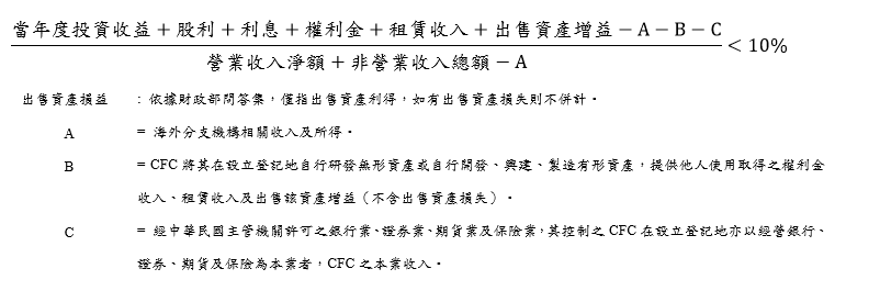 2. 受控外國企業當年度投資收益、股利、利息、權利金、租賃收入及出售資產增益(又稱「消極性所得」或「被動所得」)之合計數占營業收入淨額及非營業收入總額合計數低於10%,但: