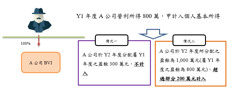 假設個人甲持有A公司100%股權,且A公司為甲之CFC,Y1年度甲依個人計算CFC所得適用辦法第6條第1項規定計算A公司之海外營利所得800萬元,應依所得基本稅額條例第12條之1併計當年度基本所得額。